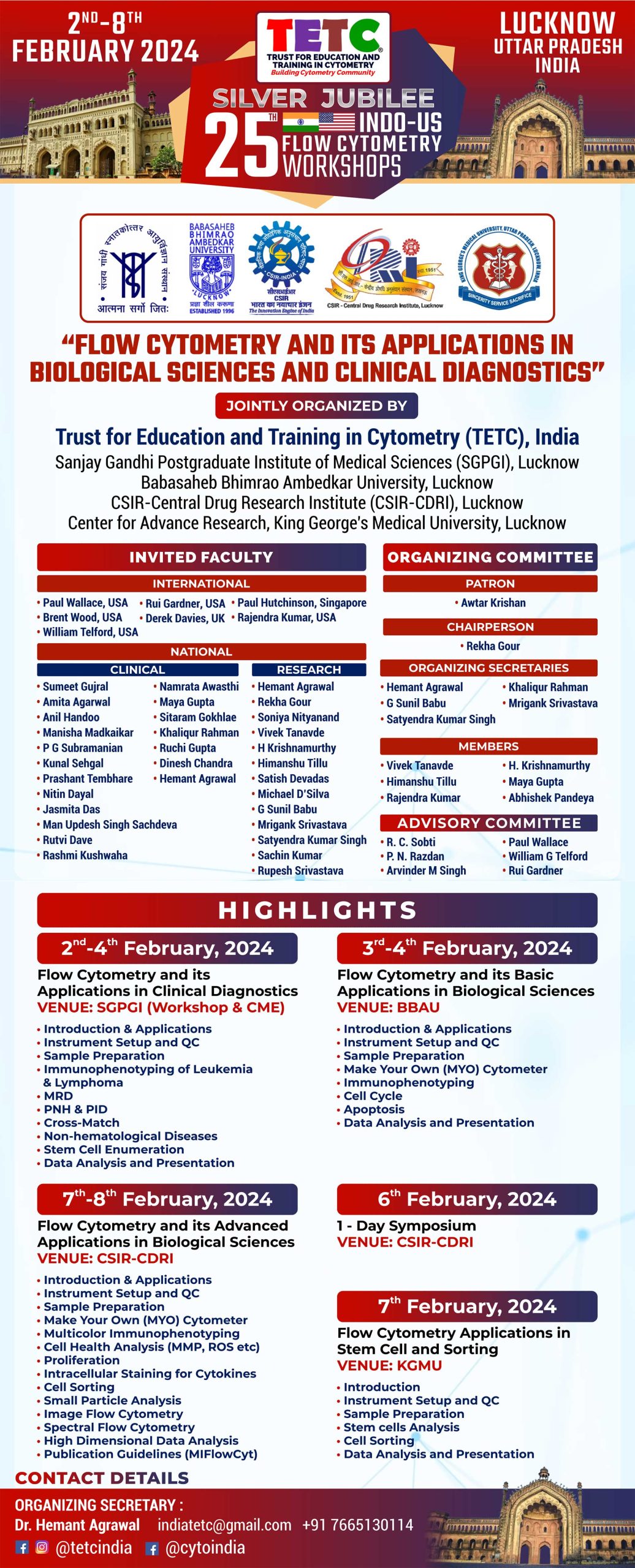 TETC is carrying the legacy ahead and is organizing SILVER JUBILEE edition of 25th INDO-US Flow Cytometry Workshops from 2nd – 8th February 2024 in the City of Lucknow, Uttar Pradesh, India in collaboration with SGPGIMS, CSIR-CDRI, BBAU and KGMU.